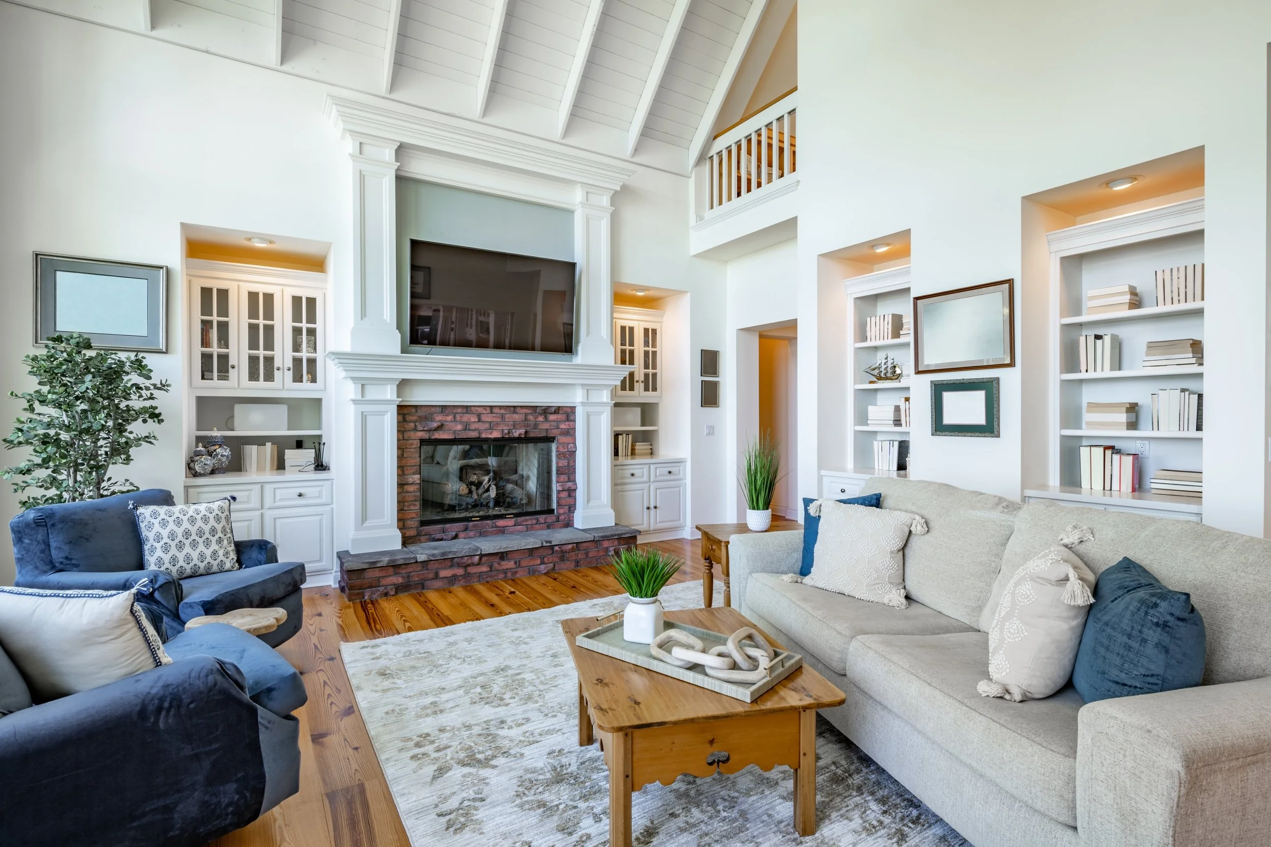 Bright living room with white walls, vaulted ceiling, brick fireplace, flat-screen TV, built-in shelves with books, cream sofa with pillows, blue armchairs, wooden coffee table with decorative items, potted plants, and hardwood flooring.