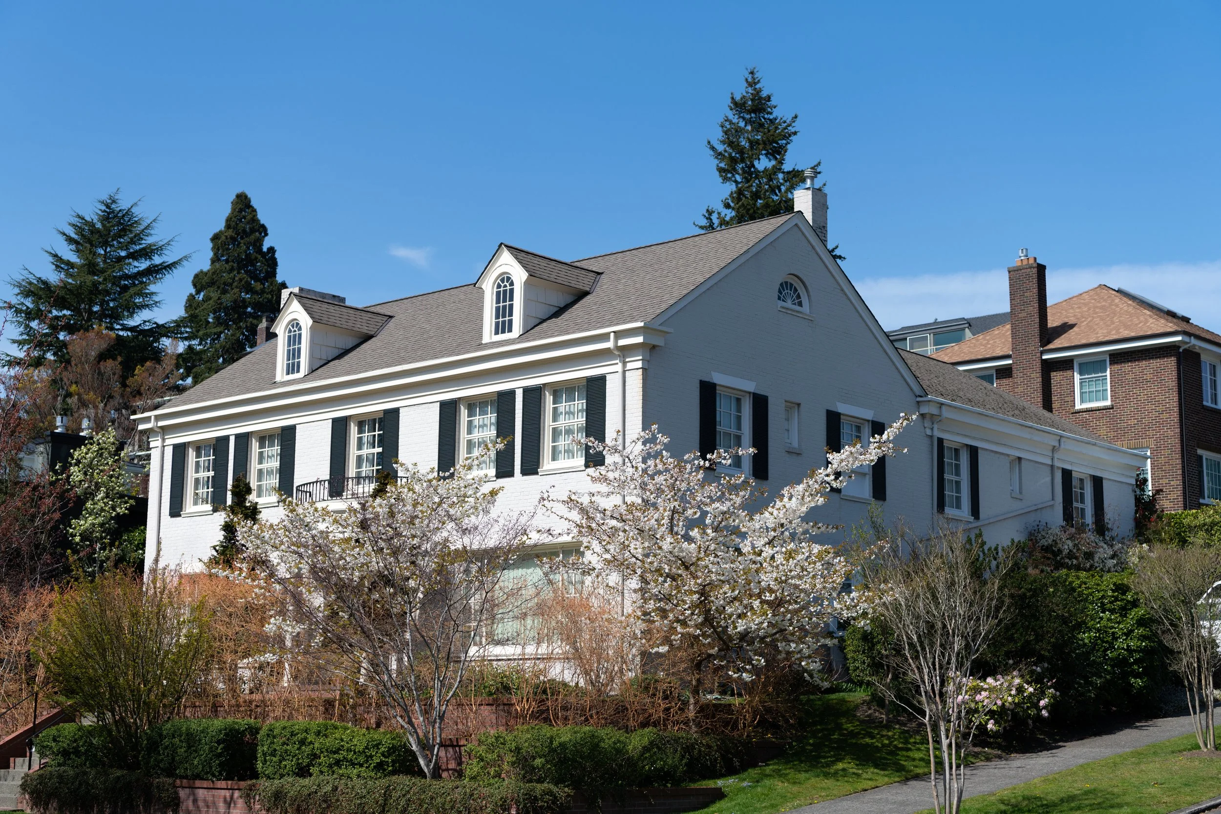 A large, white, two-story house with black shutters, dormer windows, and a sloped roof, surrounded by trees and a well-maintained garden under a clear blue sky.
