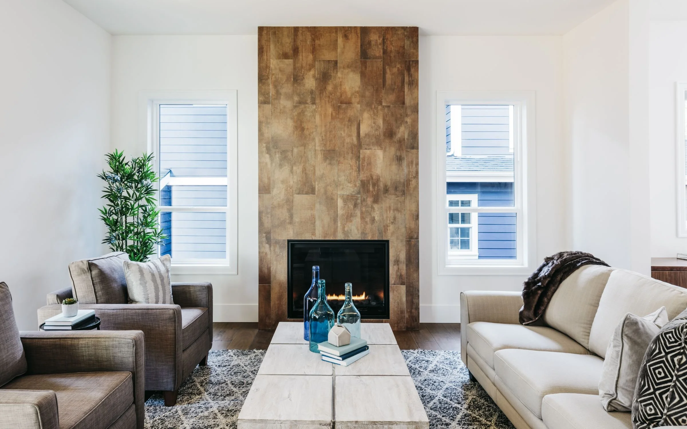 Living room with a fireplace, beige and gray couches, a coffee table with decorative bottles and books, a tall plant, and windows with views of neighboring houses.