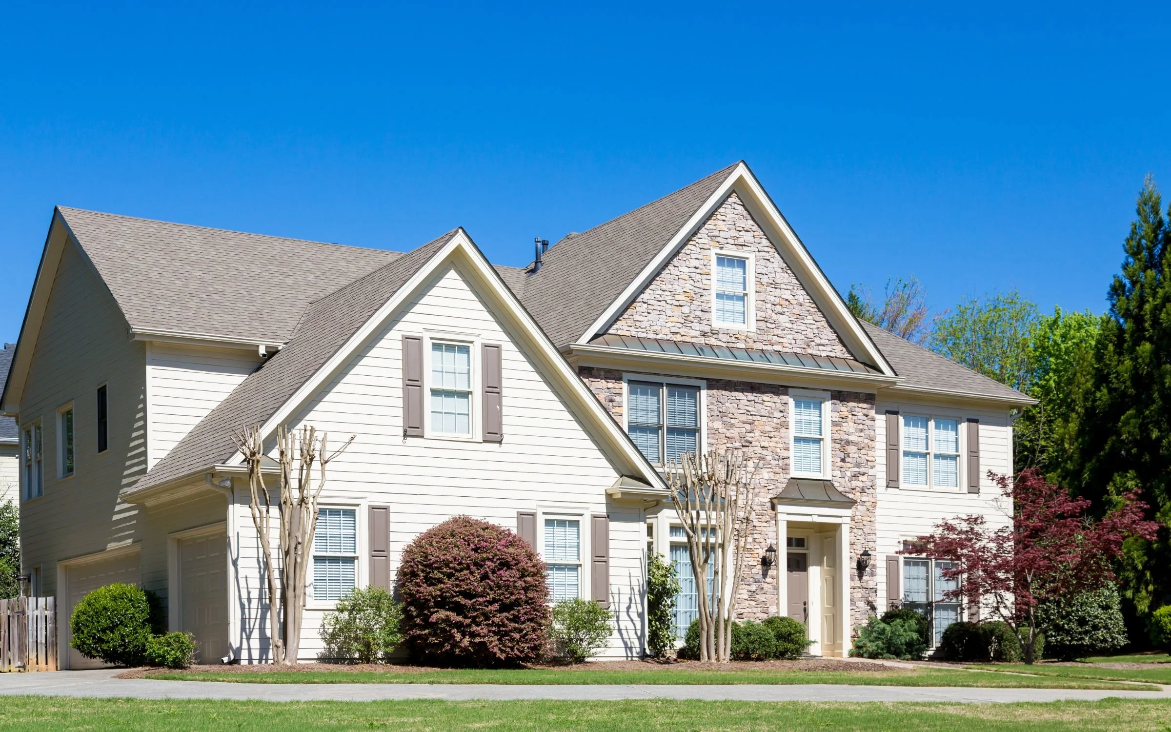 A two-story suburban house with beige siding, a stone facade at the entrance, and multiple windows with white shutters. The house is surrounded by green shrubs, trees, and a well-maintained lawn under a clear blue sky.