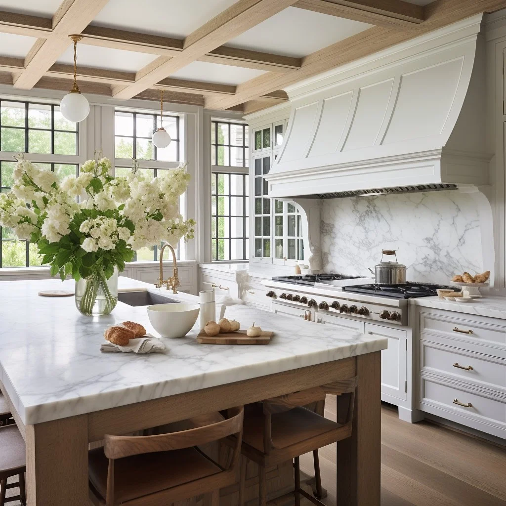 Living room with a white sofa, decorative pillows, a wooden coffee table with candles and a branch, lamps on side tables, and a view of a kitchen and outdoor area in the background.